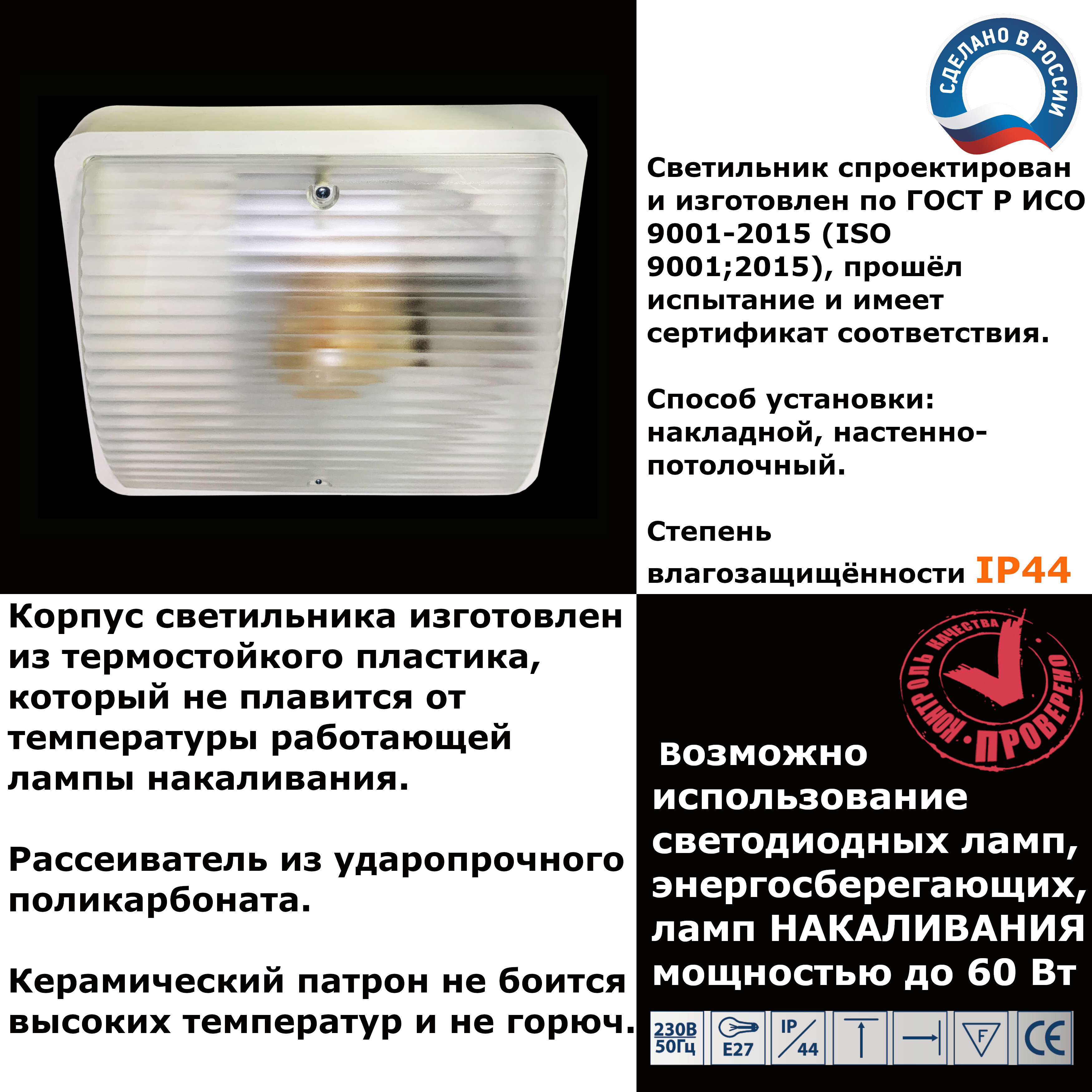 Корпус светильника изготовлен из специального термостойкого пластика, который не плавится и не загорается при использовании ламп накаливания. В наших светильниках можно использовать лампы накаливания мощностью до 60 ватт, светодиодные и энергосберегающие лампы.